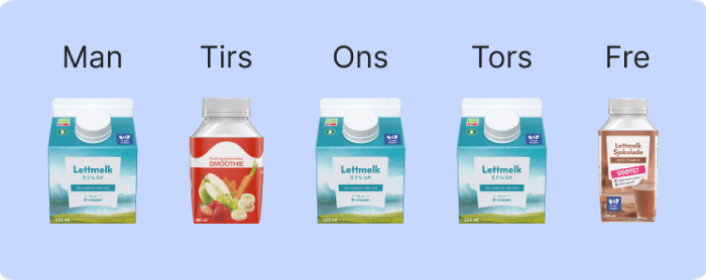 Du setter opp uka som du vil. Ønsker du samme produkt hele uka eller en variasjon? Vil du kanskje ikke ha produkter hver dag? Det er helt opp til deg! Under ser du et eksempel av hvordan uka kan se ut.